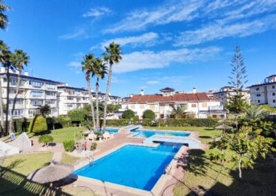 Rezidenčný komplex ponúka udržiavané dva spoločné komunitné bazény obklopené zeleňou, ideálne na osvieženie počas teplých dní. V areáli komplexu sa nachádza aj detské ihrisko a petangové ihrisko. Areál pôsobí pokojne, čisto a bezpečne.